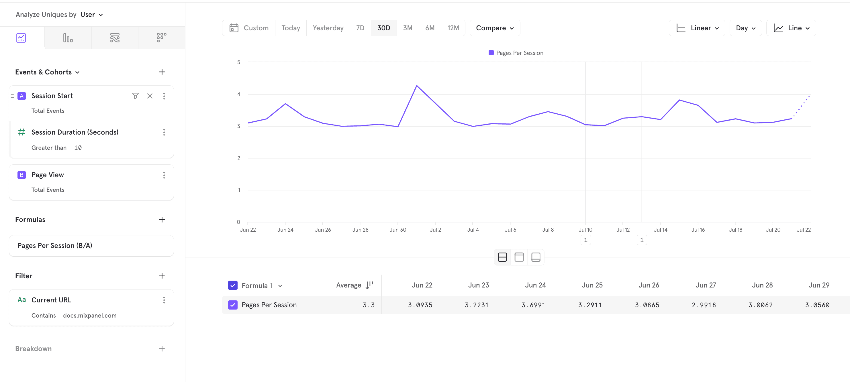 This tells us that the average number of pages per session is ~1.3 and has been fairly stable. This is fairly common due to bounces (sessions where users just see one page and quickly bounce). To filter out bounces, we can filter for sessions that are longer than 10 seconds: