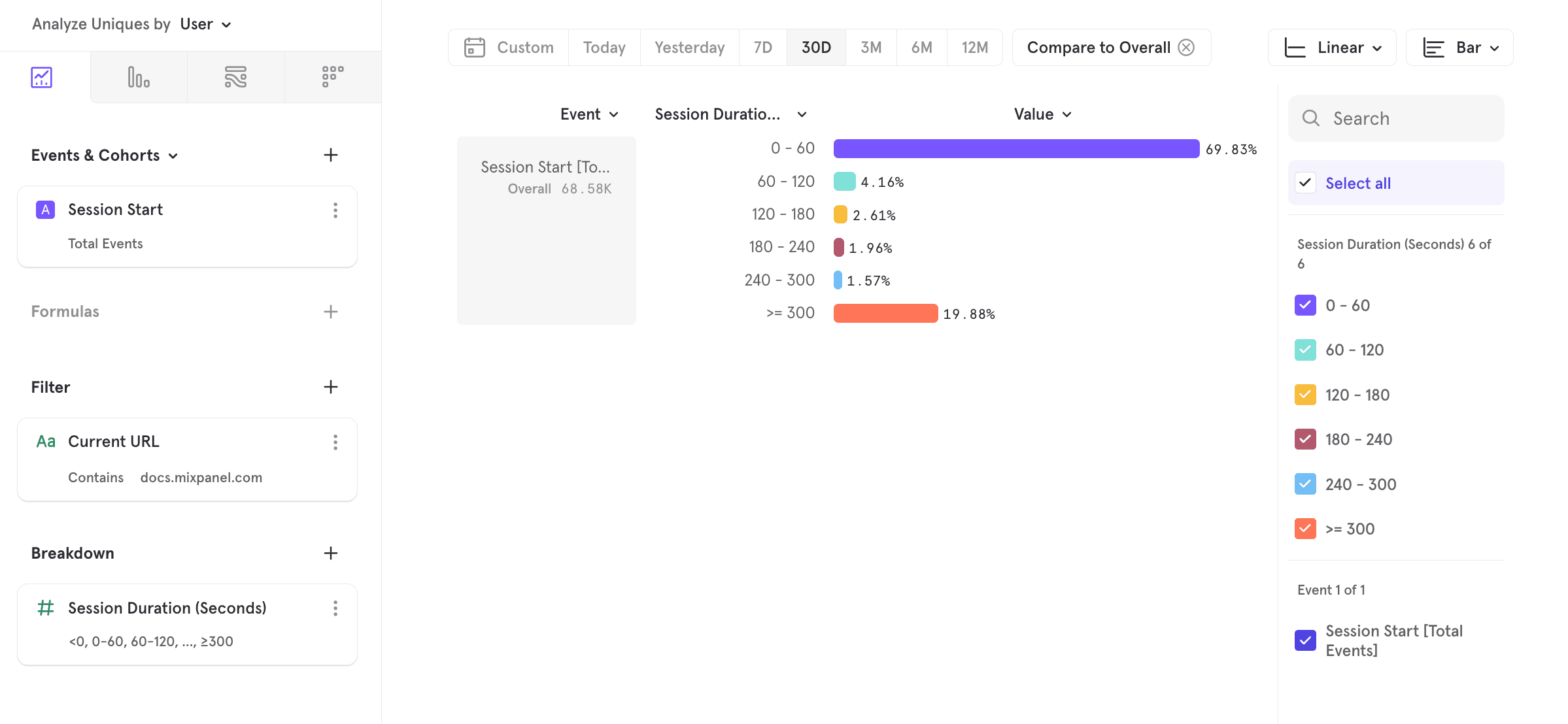 It looks like people spend ~5 minutes on average on our documentation site. Averages can hide skew, so we can also see a distribution by breaking down by the Session Duration property: