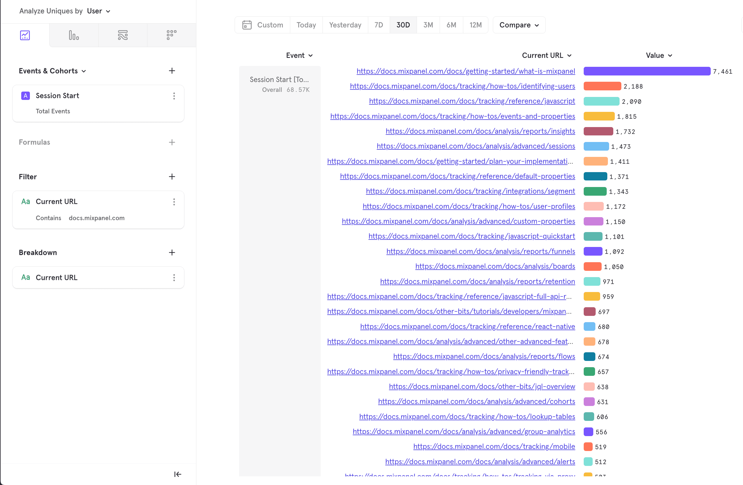 Here we see that the most common landing page is the “What is Mixpanel?” page of our docs, followed by the page on “Identifying Users”. We might use this insight to decide which parts of our documentation to invest more in.